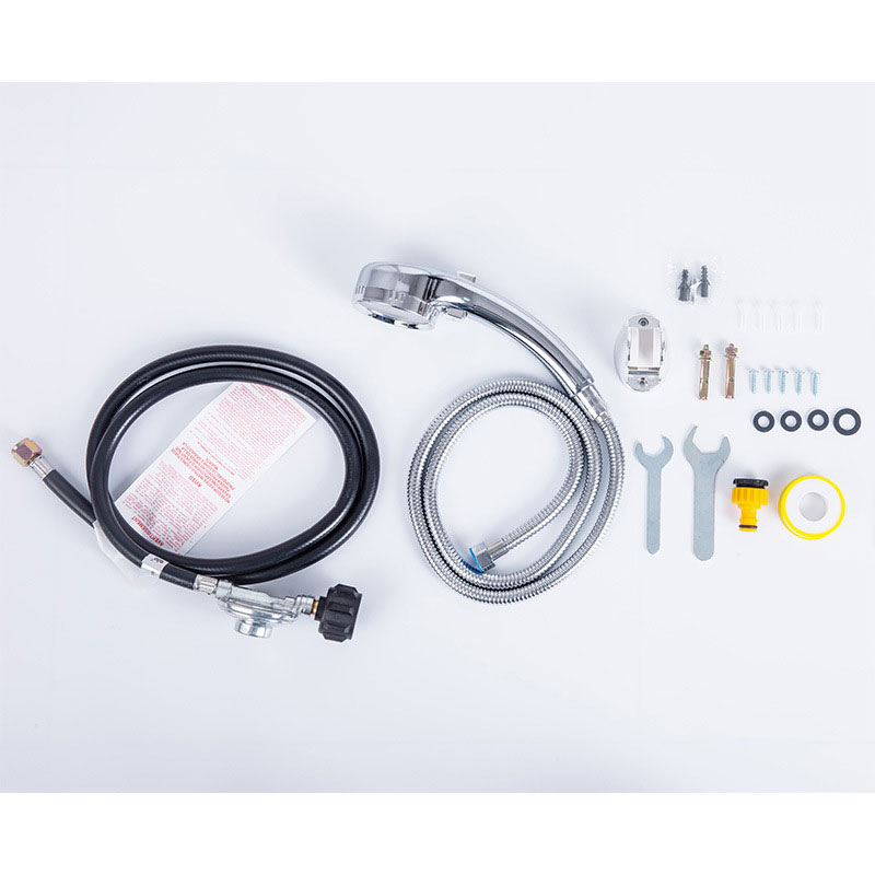 5) Ein komplettes Zubehörset für Camping, einschließlich Gasschlauch und -regler, Brauseschlauch, Duschkopf usw.
